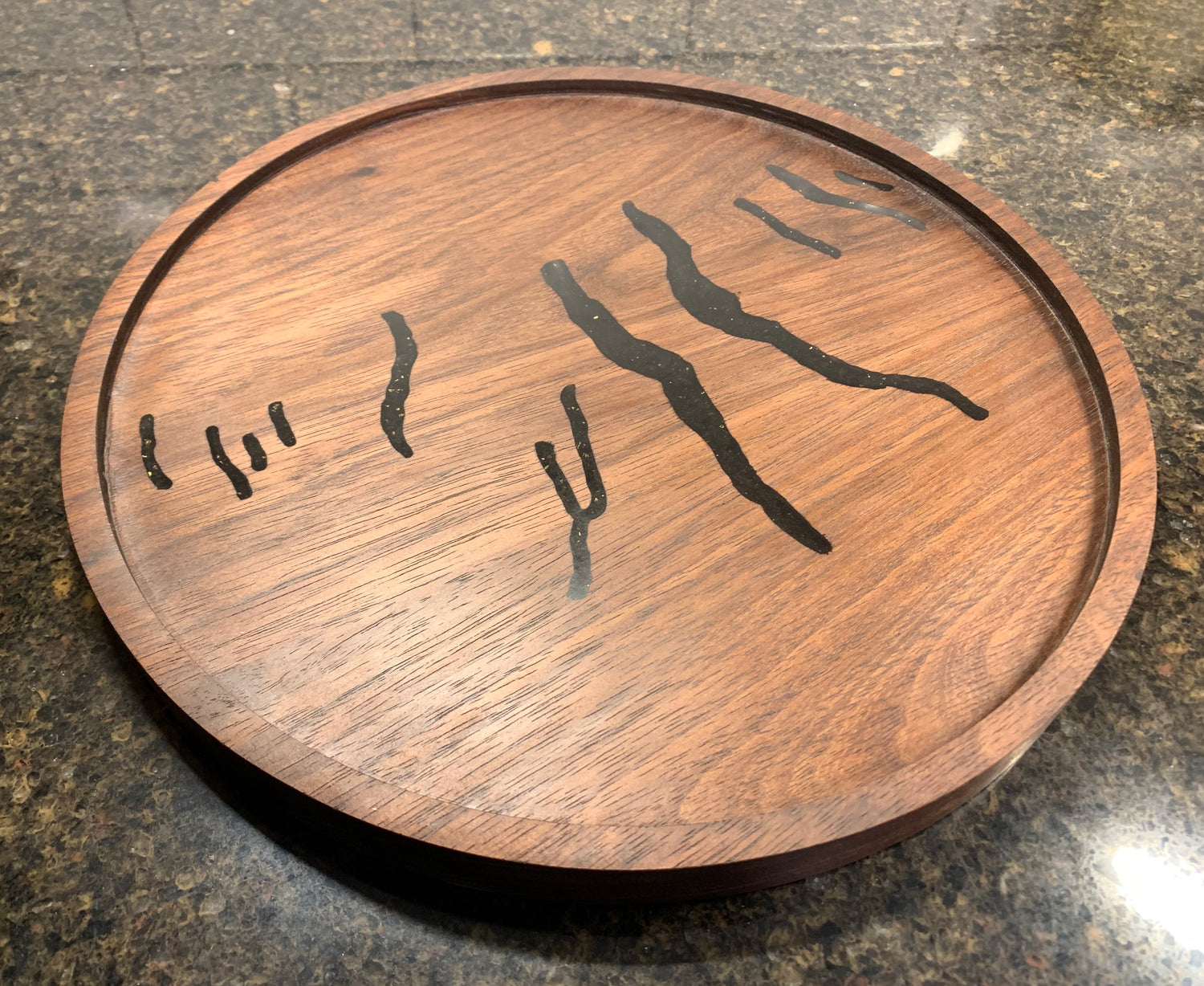 We love custom projects like this hand carved Finger Lakes drink tray with inset handles and resin inlay. Please send a message with your custom project idea.